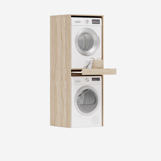 • Szafka łazienkowa nad pralkę z białymi frontami, stojąca nad pralką w nowoczesnej łazience. Funkcjonalna nadstawka nad pralkę z miejscem do przechowywania. Idealny regał łazienkowy z miejscem na detergenty i ręczniki.