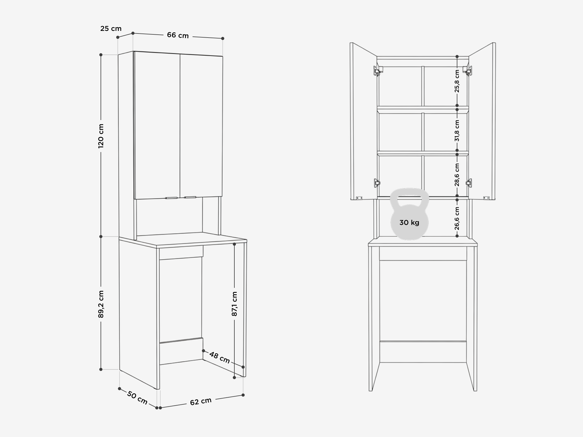 • Profundidad: 25 cm (parte superior); 50 cm o 56 cm (parte inferior)