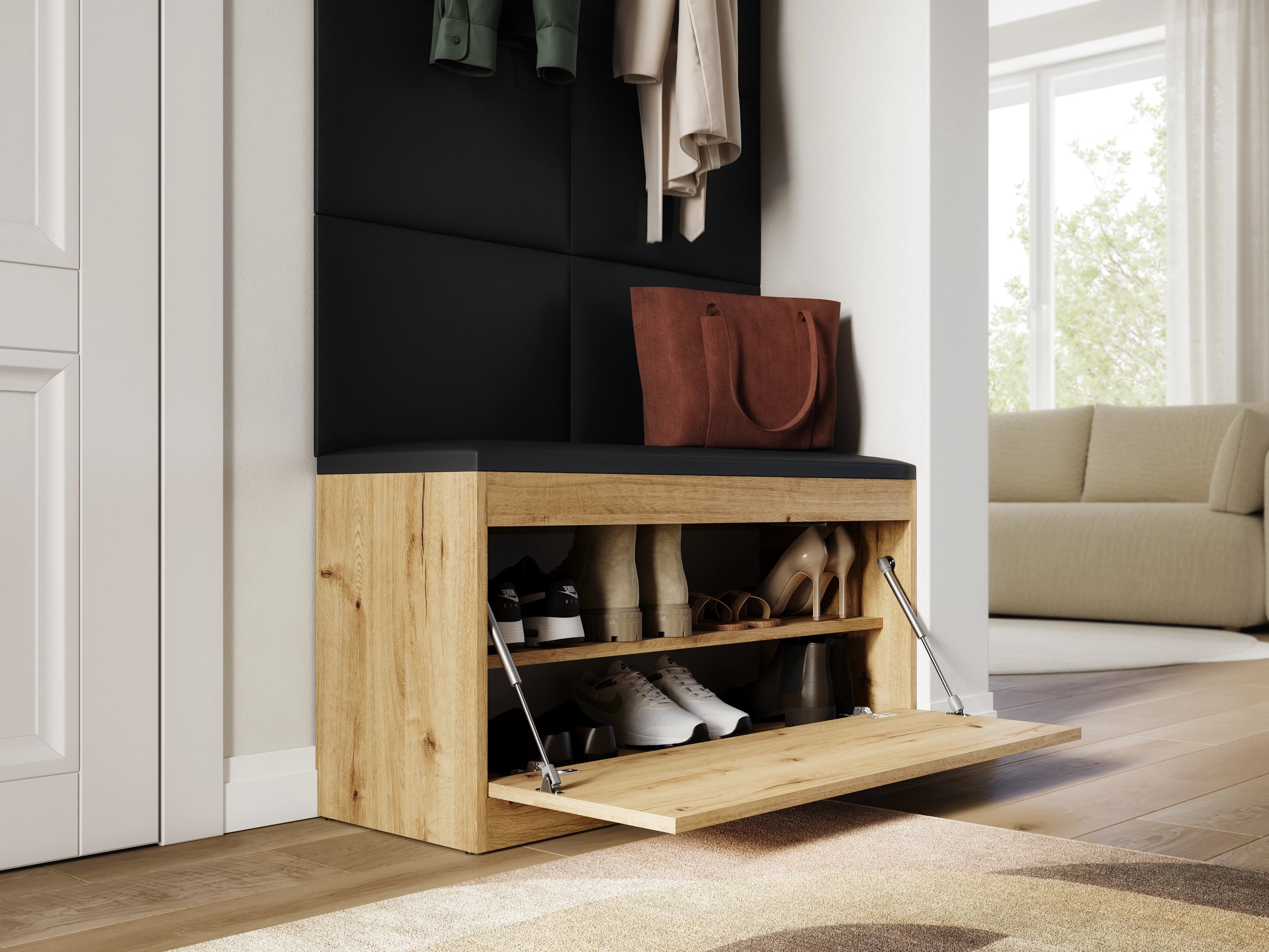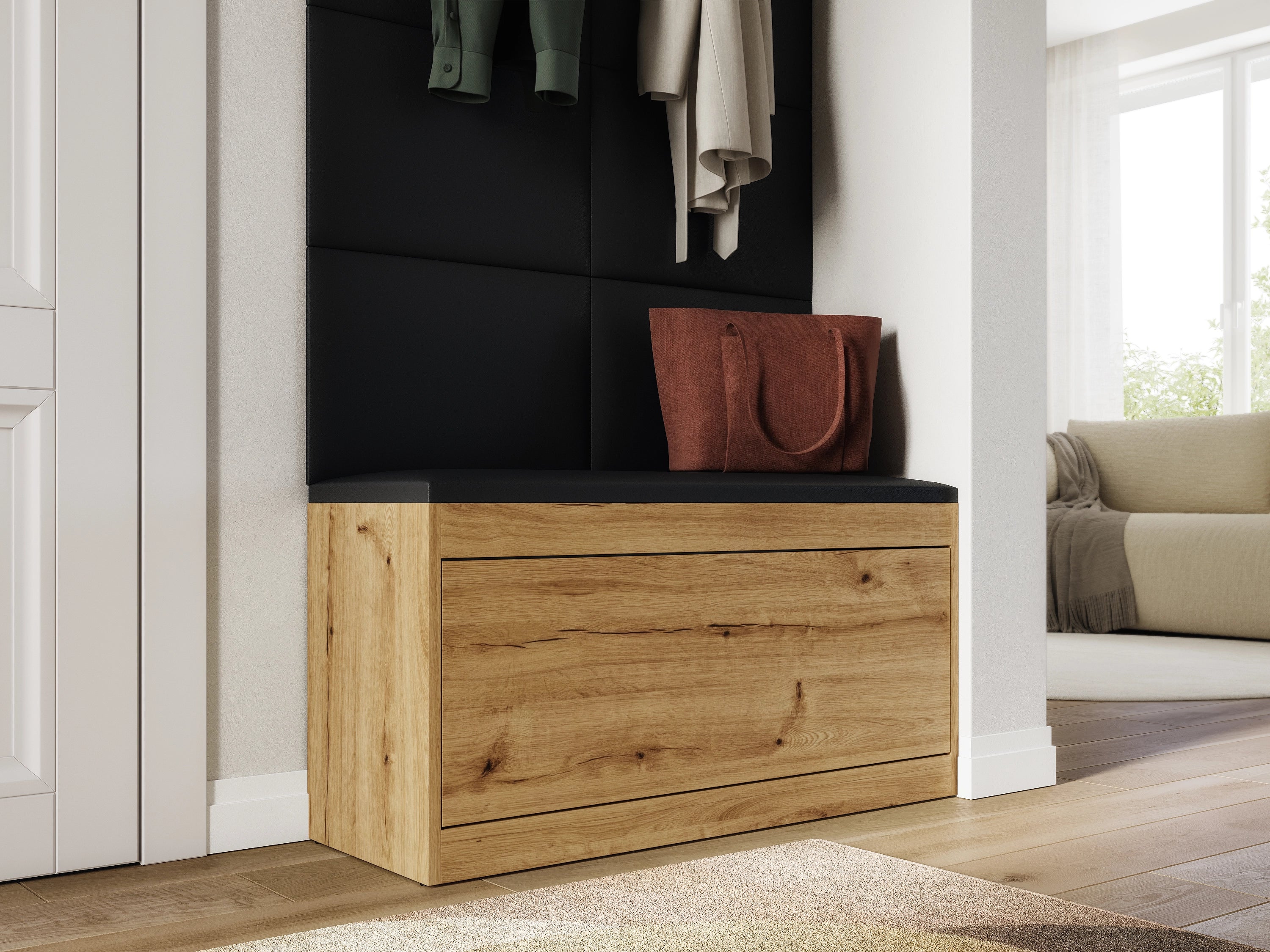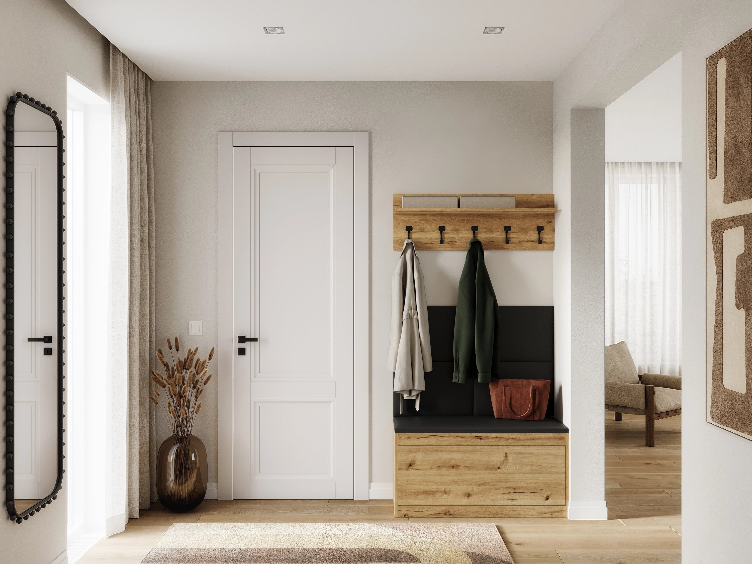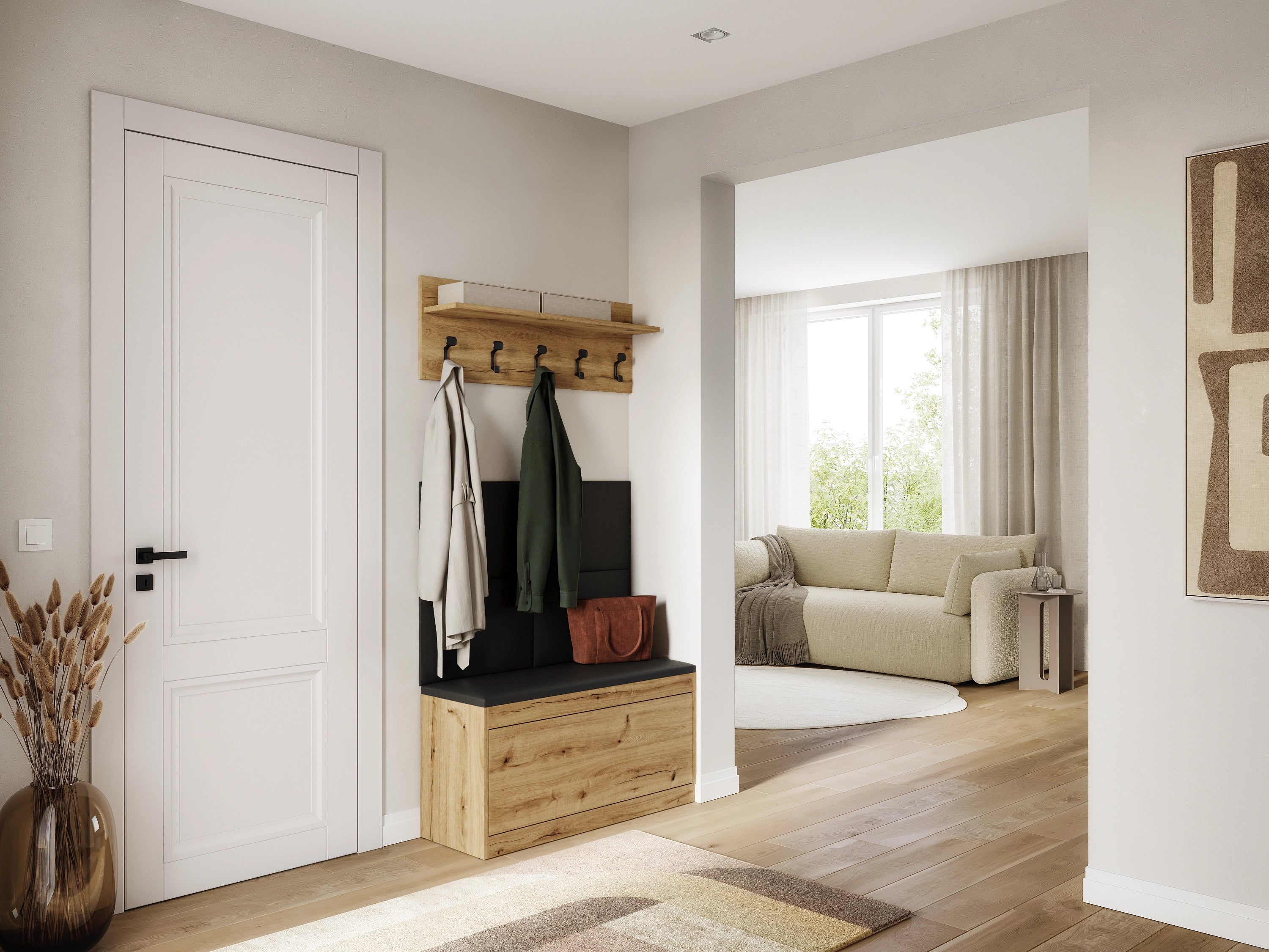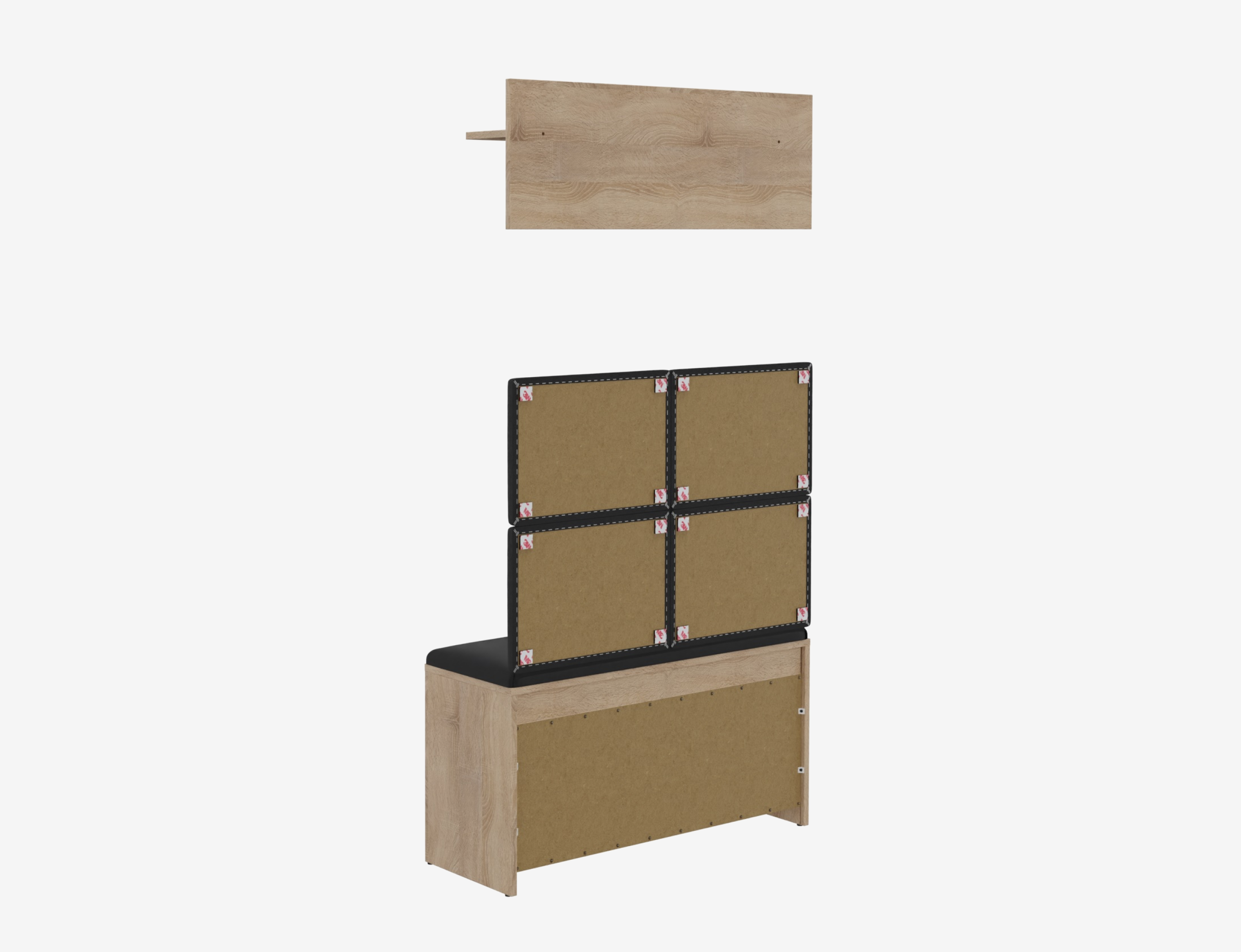 Garderoba EMI to solidny, praktyczny i nowoczesny zestaw do przedpokoju, wykonany z materiałów najwyższej jakości. Zawiera szafkę na buty z siedziskiem, półkę z wieszakami oraz tapicerowane panele ścienne, zapewniając stylowe i funkcjonalne miejsce do przechowywania i organizacji.