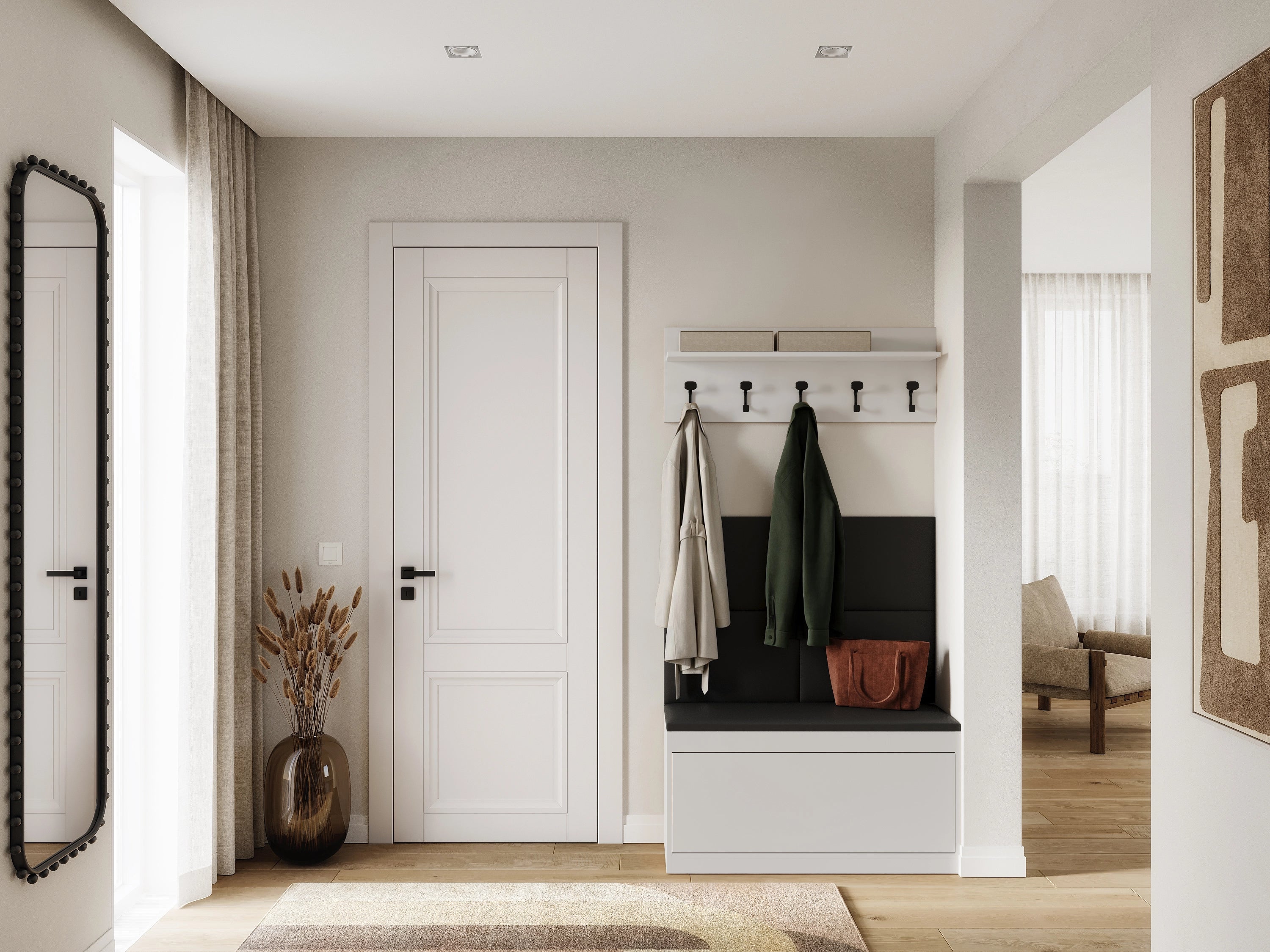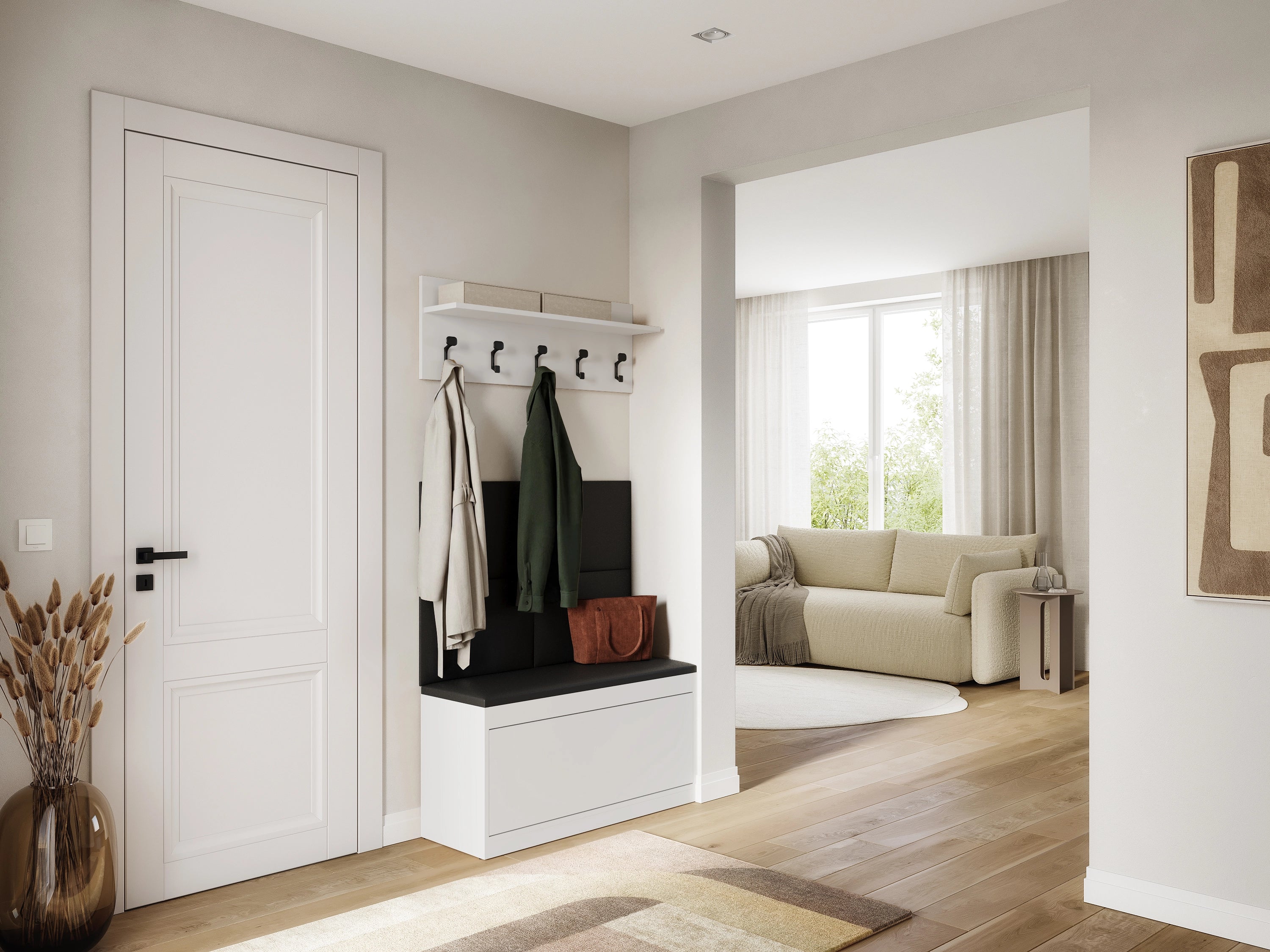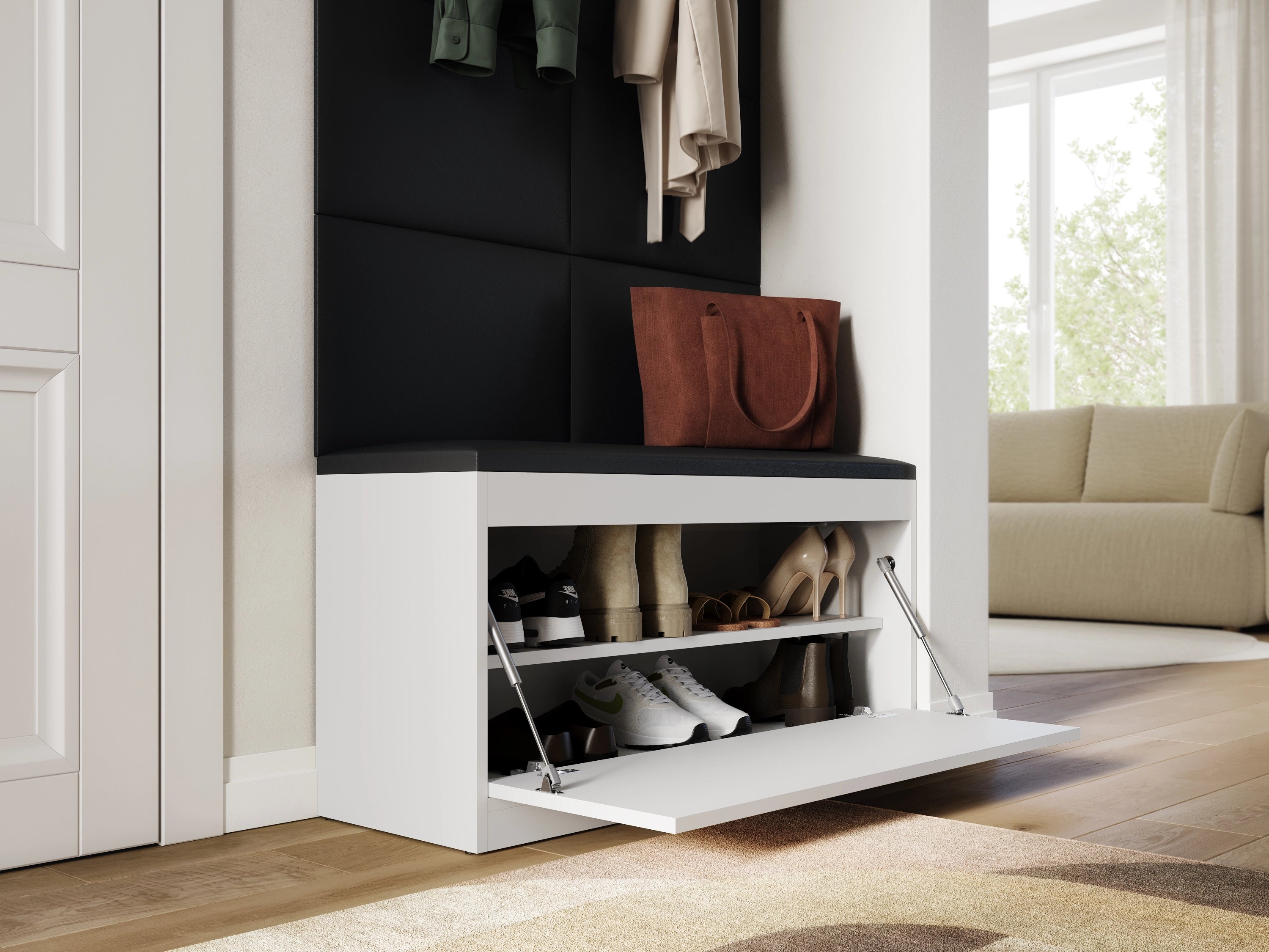 The EMI wardrobe is a solid, practical and modern hallway set, made of the highest quality materials. It includes a shoe cabinet with a seat, a shelf with hangers and upholstered wall panels, providing stylish and functional storage and organization space.