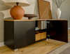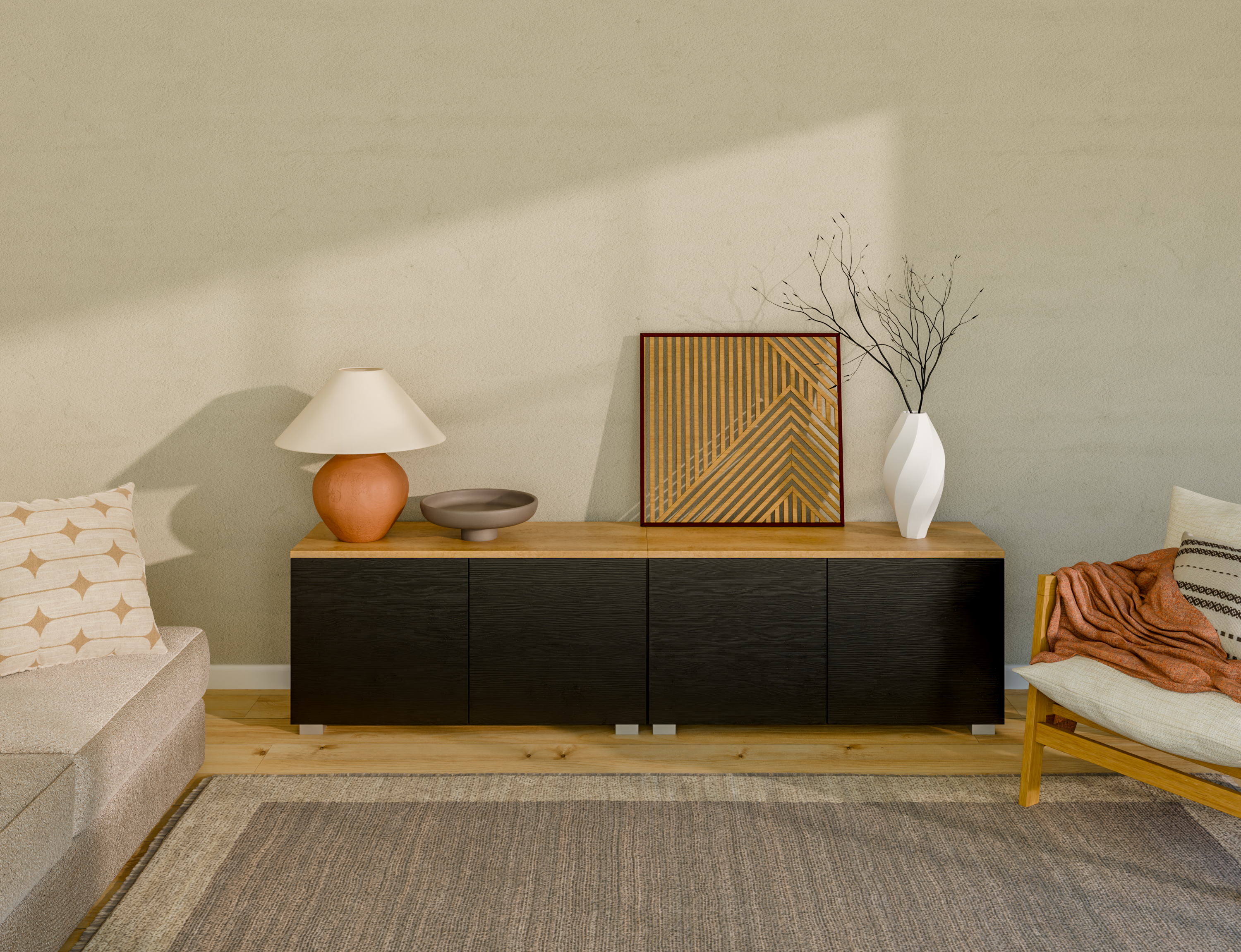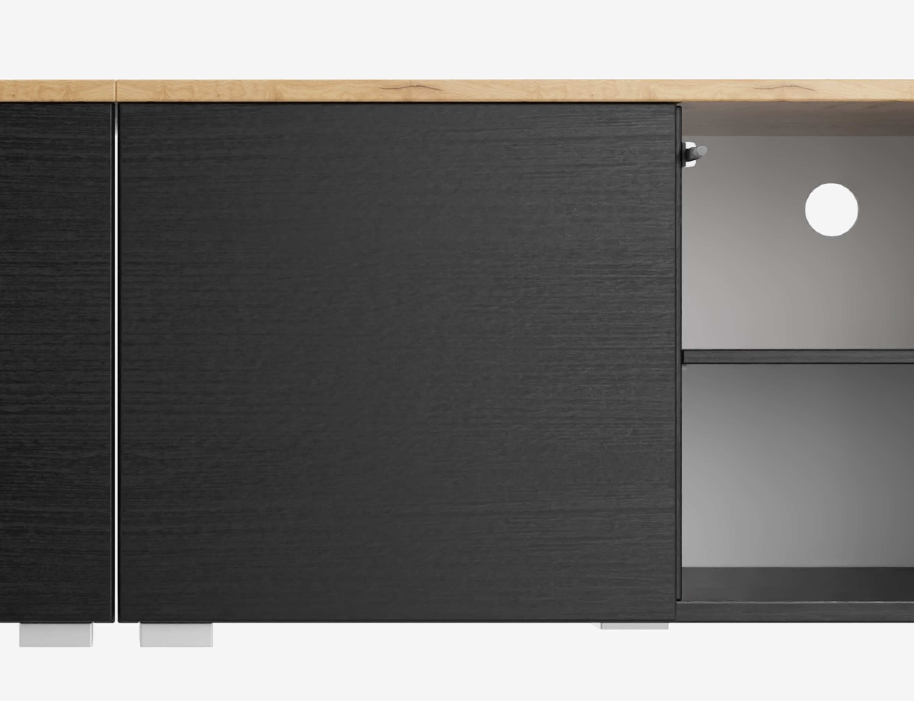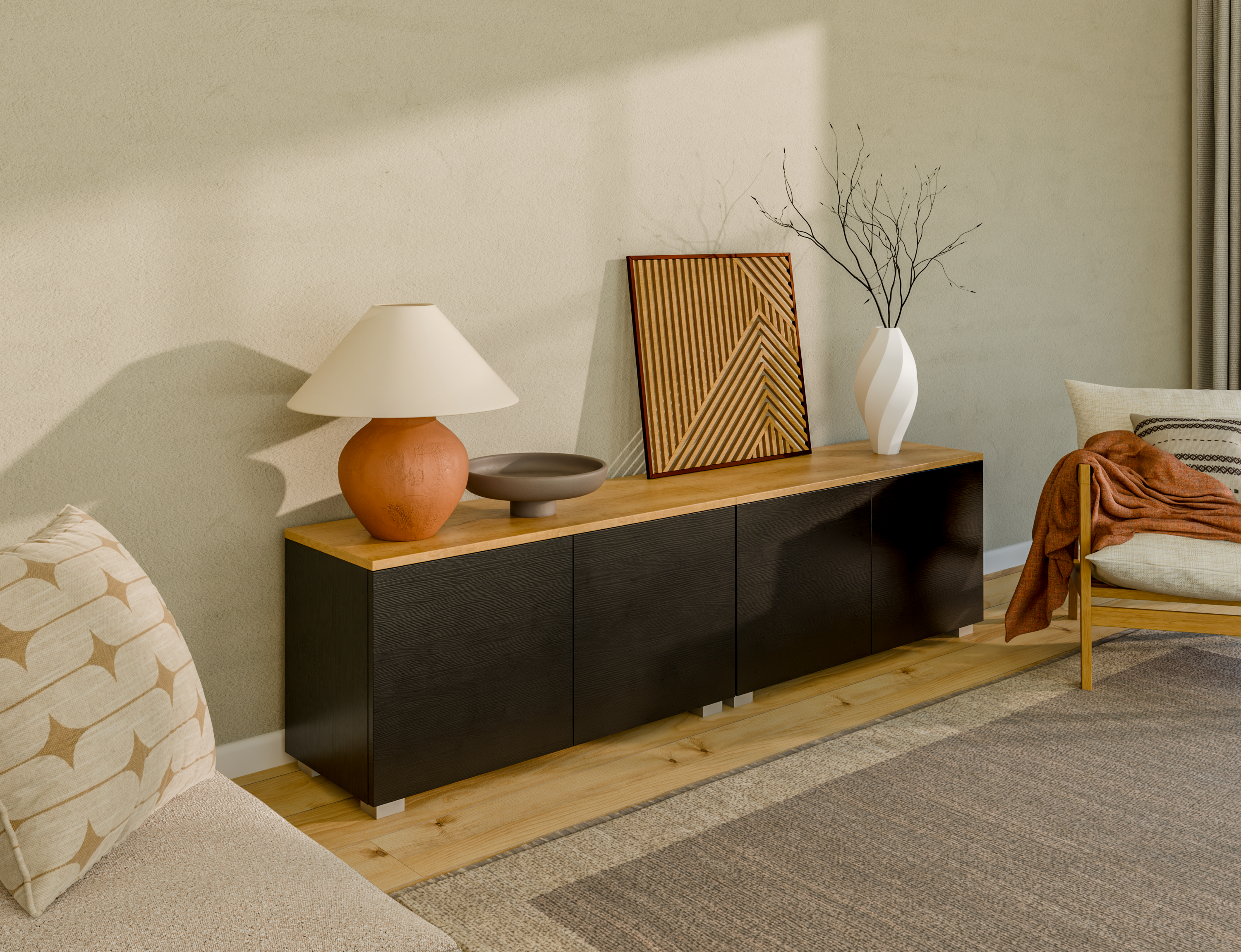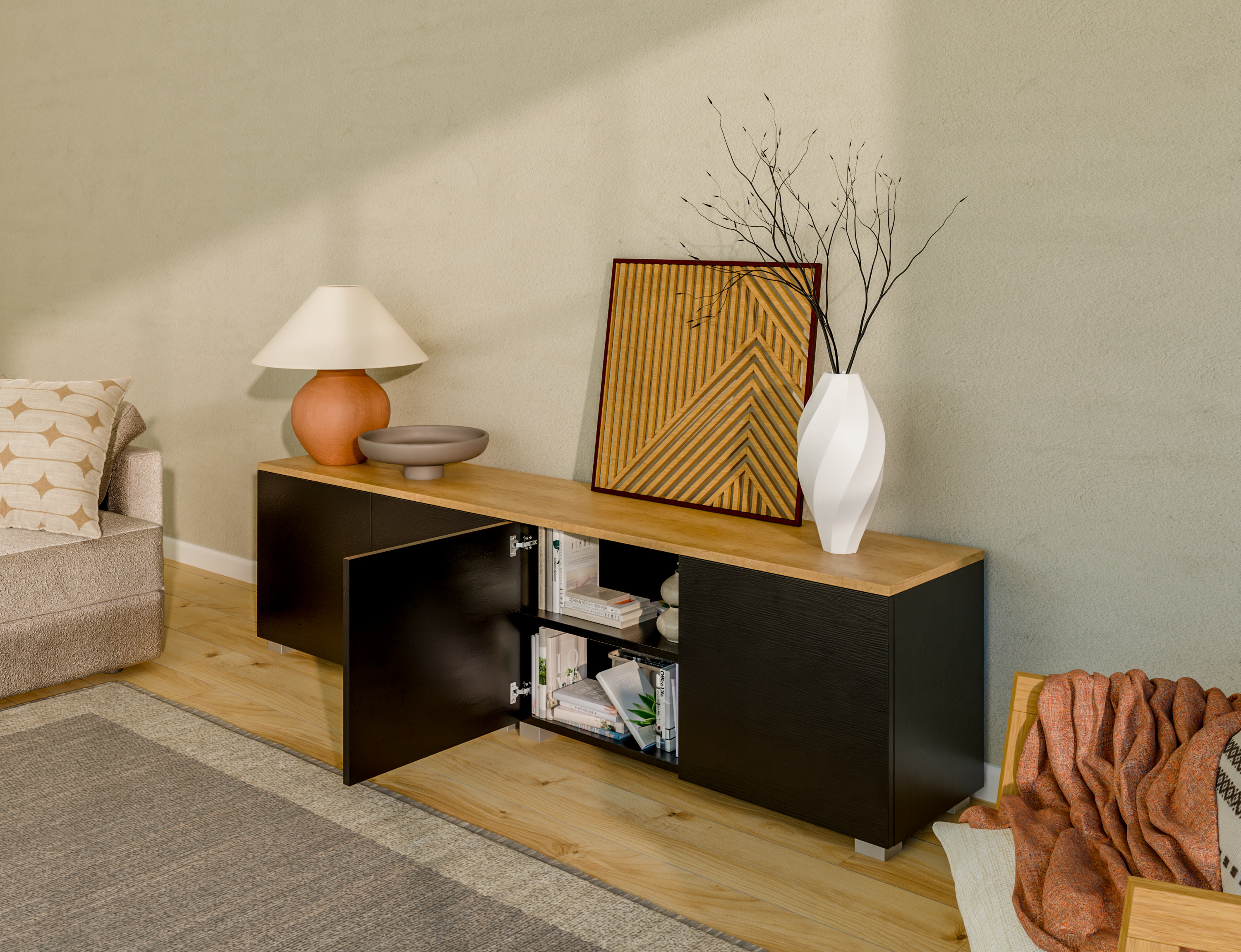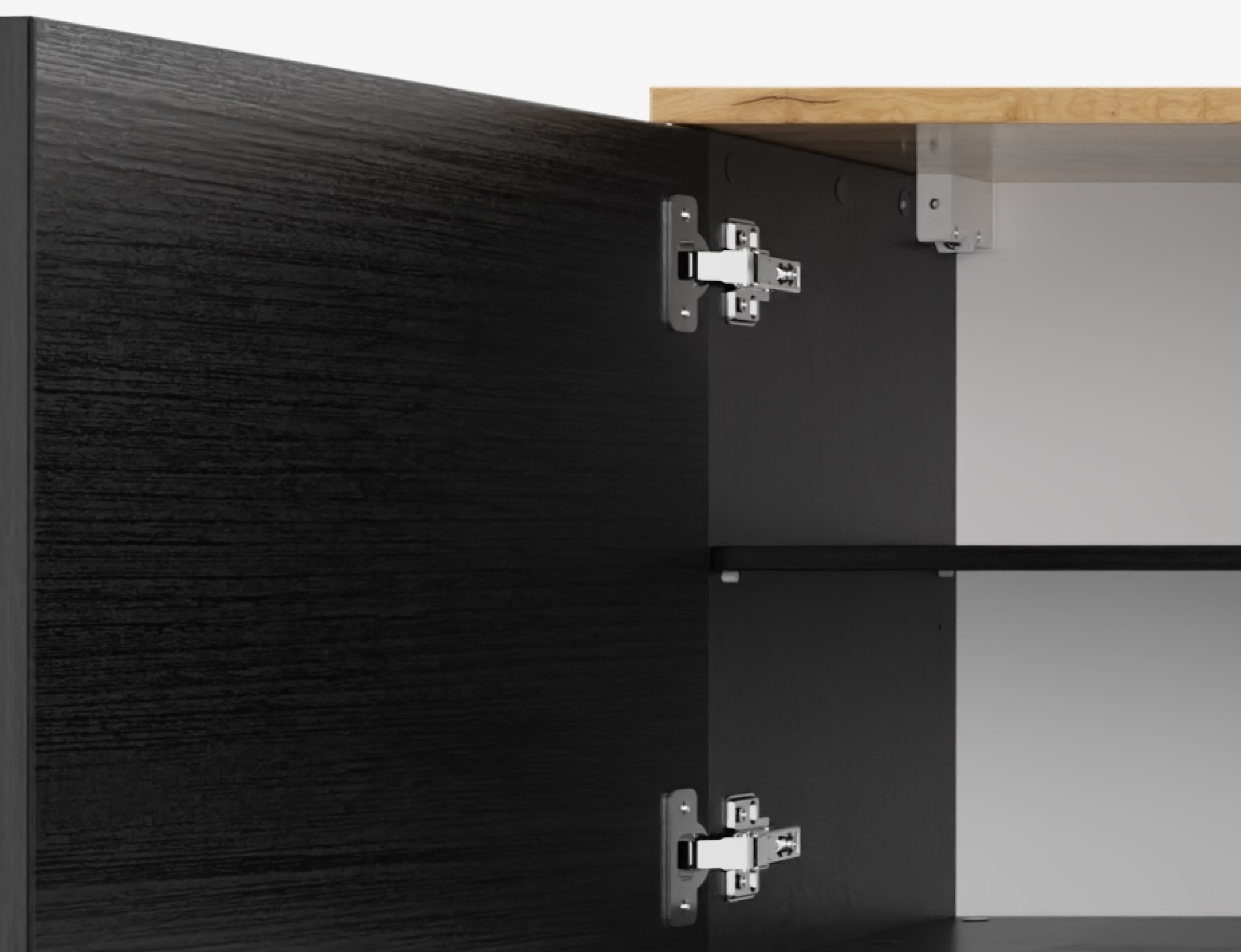 The TV cabinet from the LUNA collection is characterized by a simple and modern design. The top plate of this variant is made in oak color with a matte finish, which gives it a luxurious and unique look. Thanks to the push-to-open function, you can easily open the door without using handles or handles.